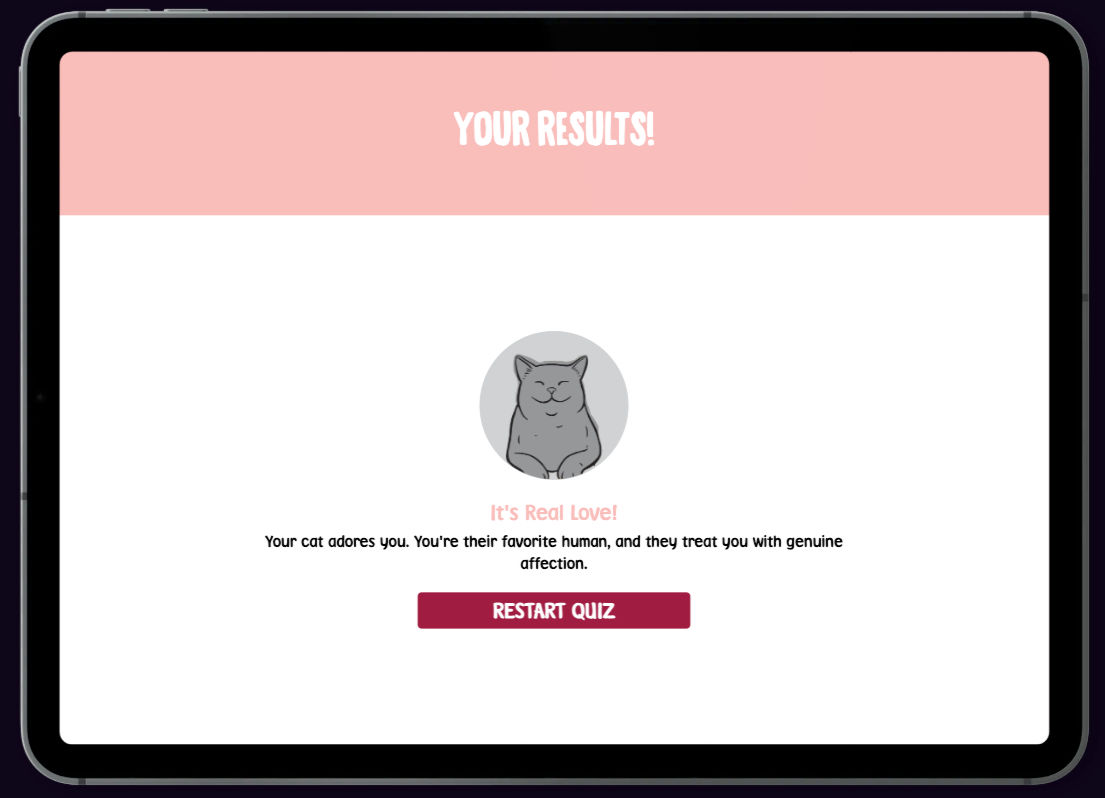 Just for fun (and cat people)We built a playful, personality-packed quiz to help pet lovers find out just how much their cat *really* loves them — and share the results with their fellow feline fans.